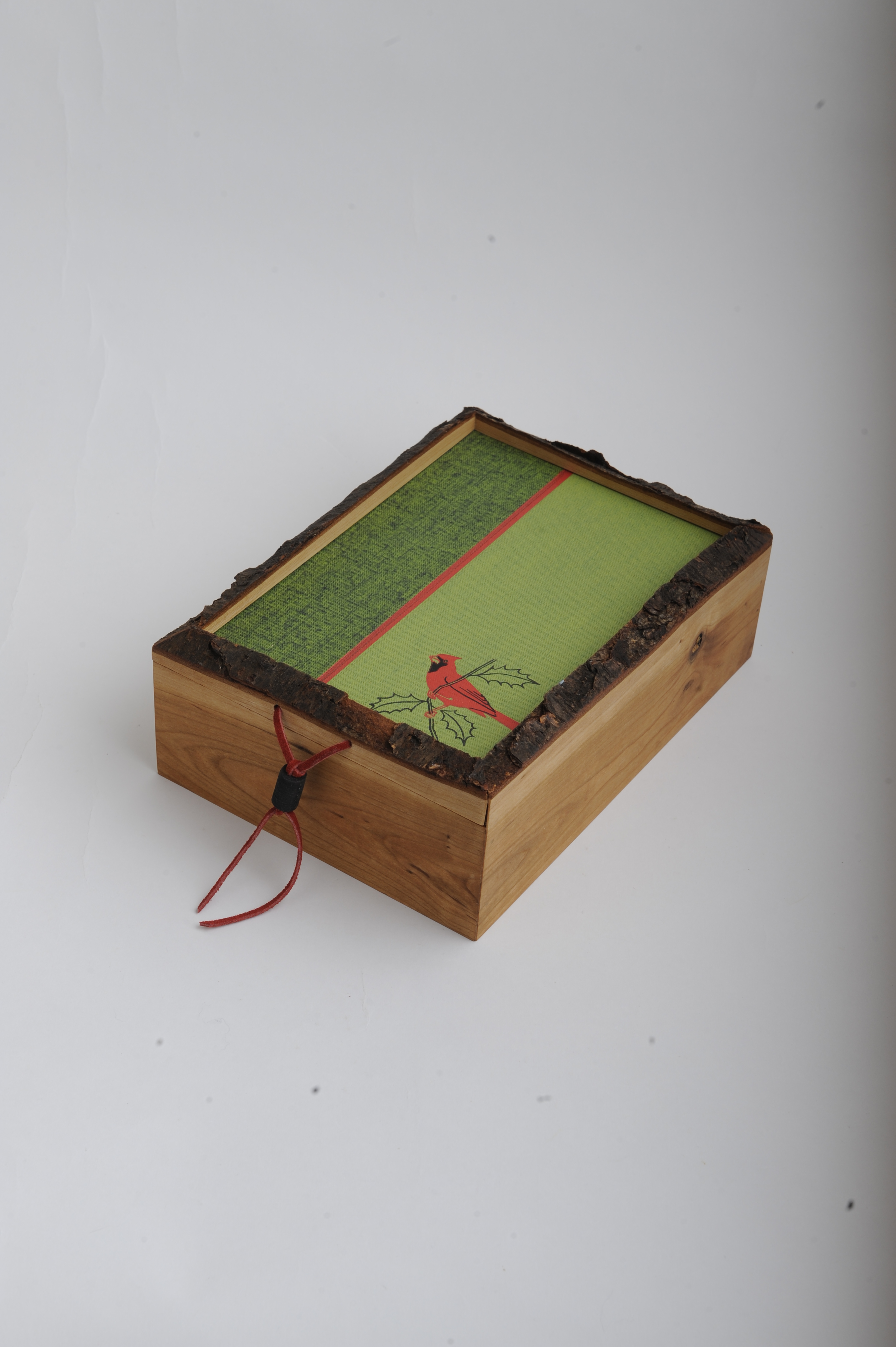 Cardinal book cover box Box is live-edge cherry with pull handle of leather and milk-painted wooden bead.