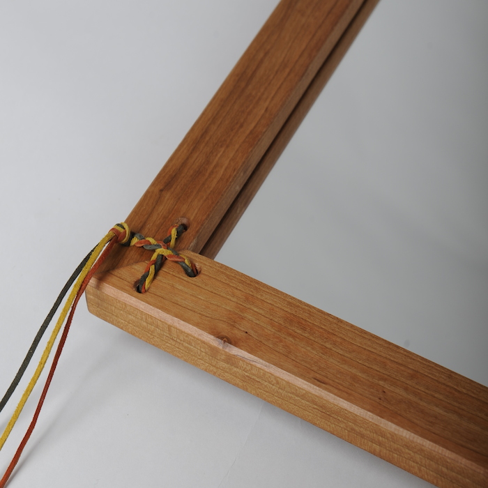 Leather laced corners. Strands drape off the sides.