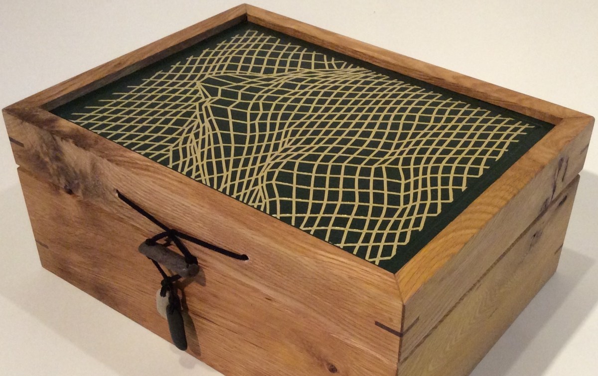 The bold topography graphic on the cover works beautifully with the oak and leather.