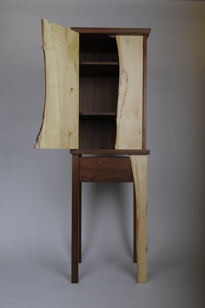 front open Solid chestnut off-width doors with dramatic spalting. Two adjustable walnut shelves inside.