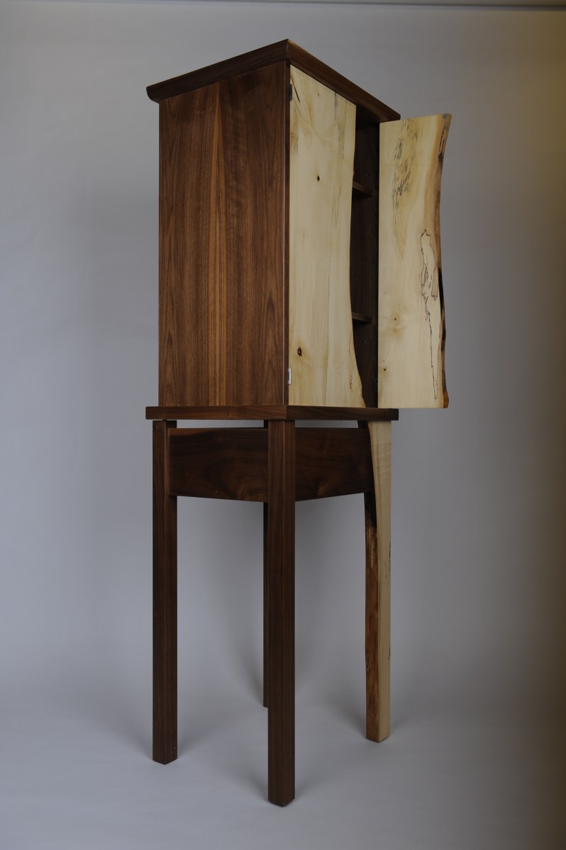 side open The smaller door is inset to sit behind the wider door. Sides feature book matched walnut veneer.