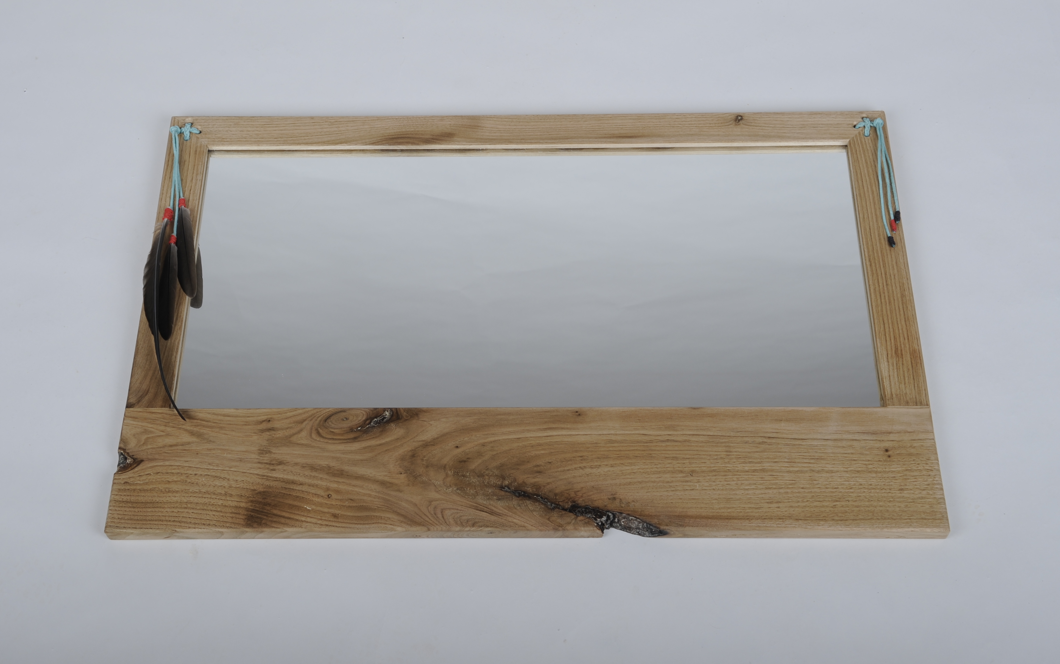 Walnut wall mirror with leather and wild sourced Canada Goose feathers. $230.00