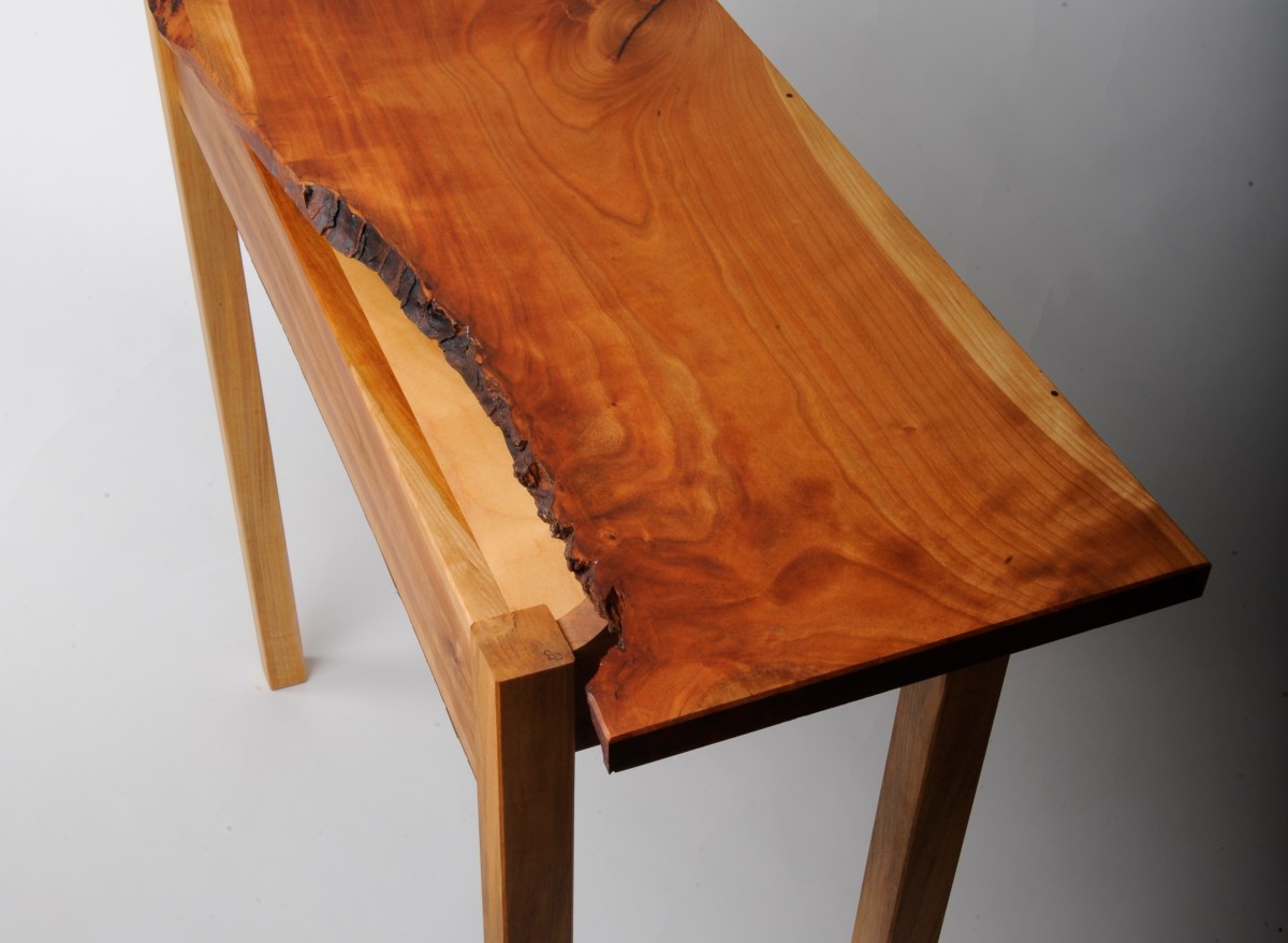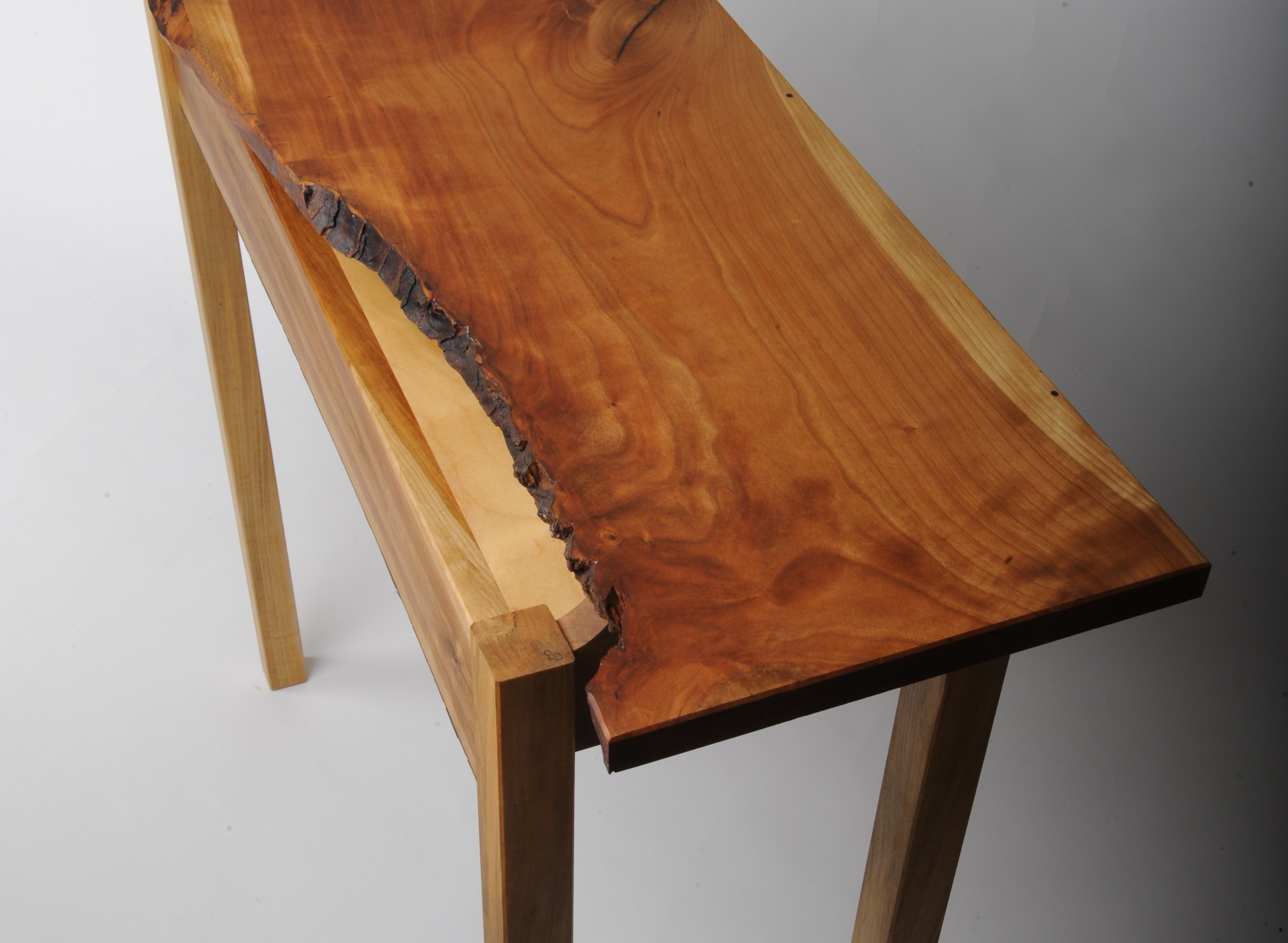 Jagged, dramatic live-edge with cutaway reveals maple legs and shelf.