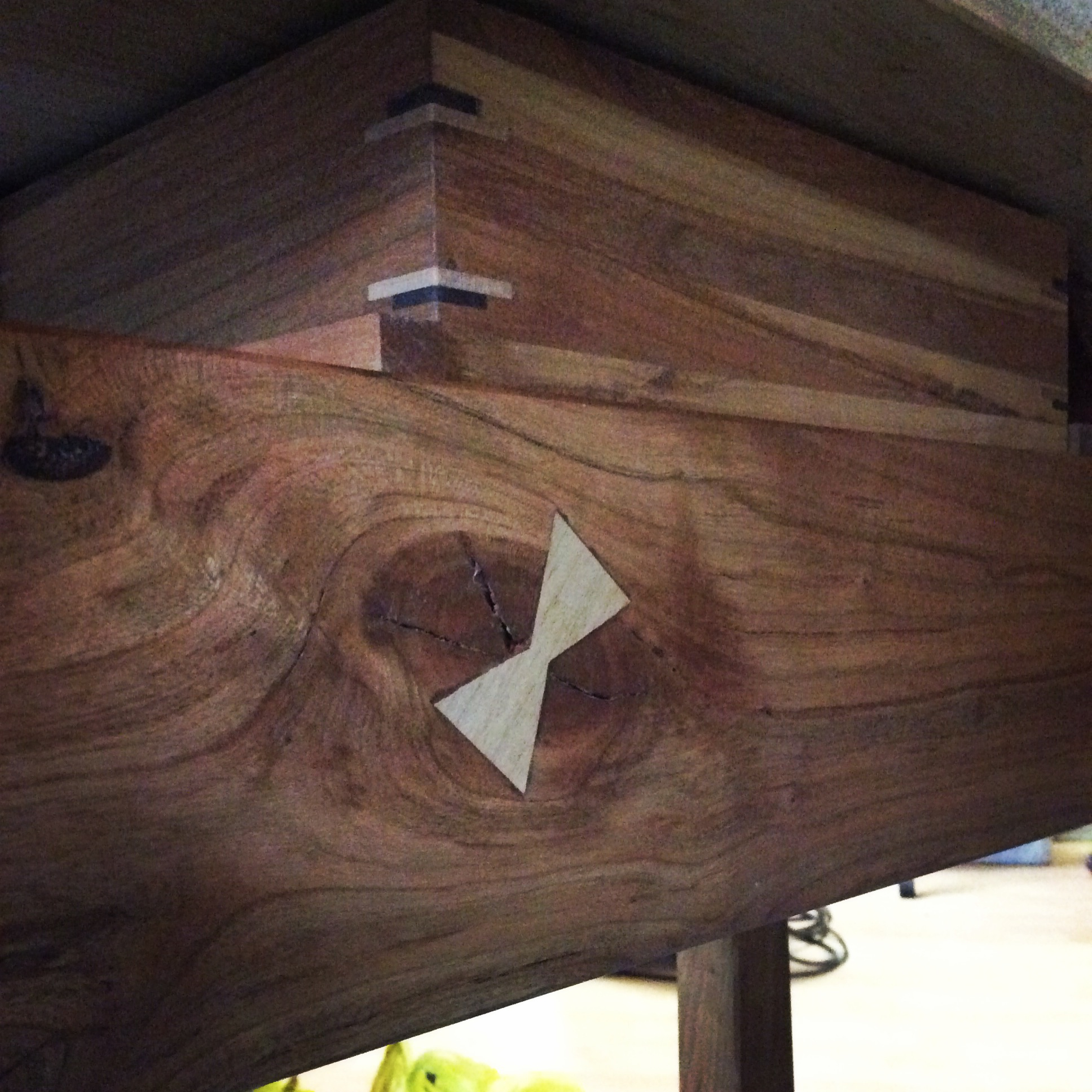 Butterfly and spline joinery. Butterfly joints, also called “keys” and “dutchmen”, are used to prevent splits from spreading further. Splines on the drawer corner help hold box together.