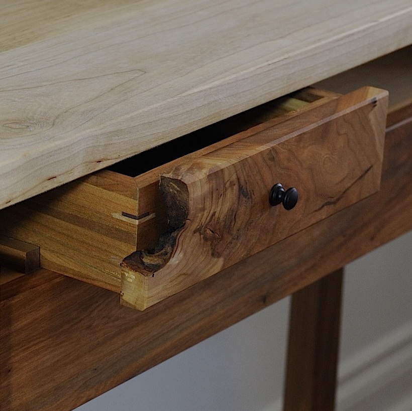 Burled Cherry Drawer Front The natural curve of the burl on the drawer front reveals the spline joinery on the drawer.
