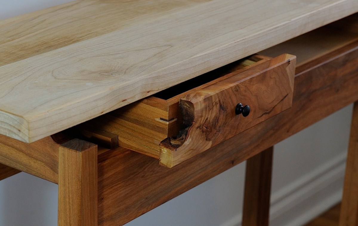 Cherry Burl Drawer Front The natural shape of the cherry burl front allows for the corner of the drawer to show through with its walnut and maple spline joinery.