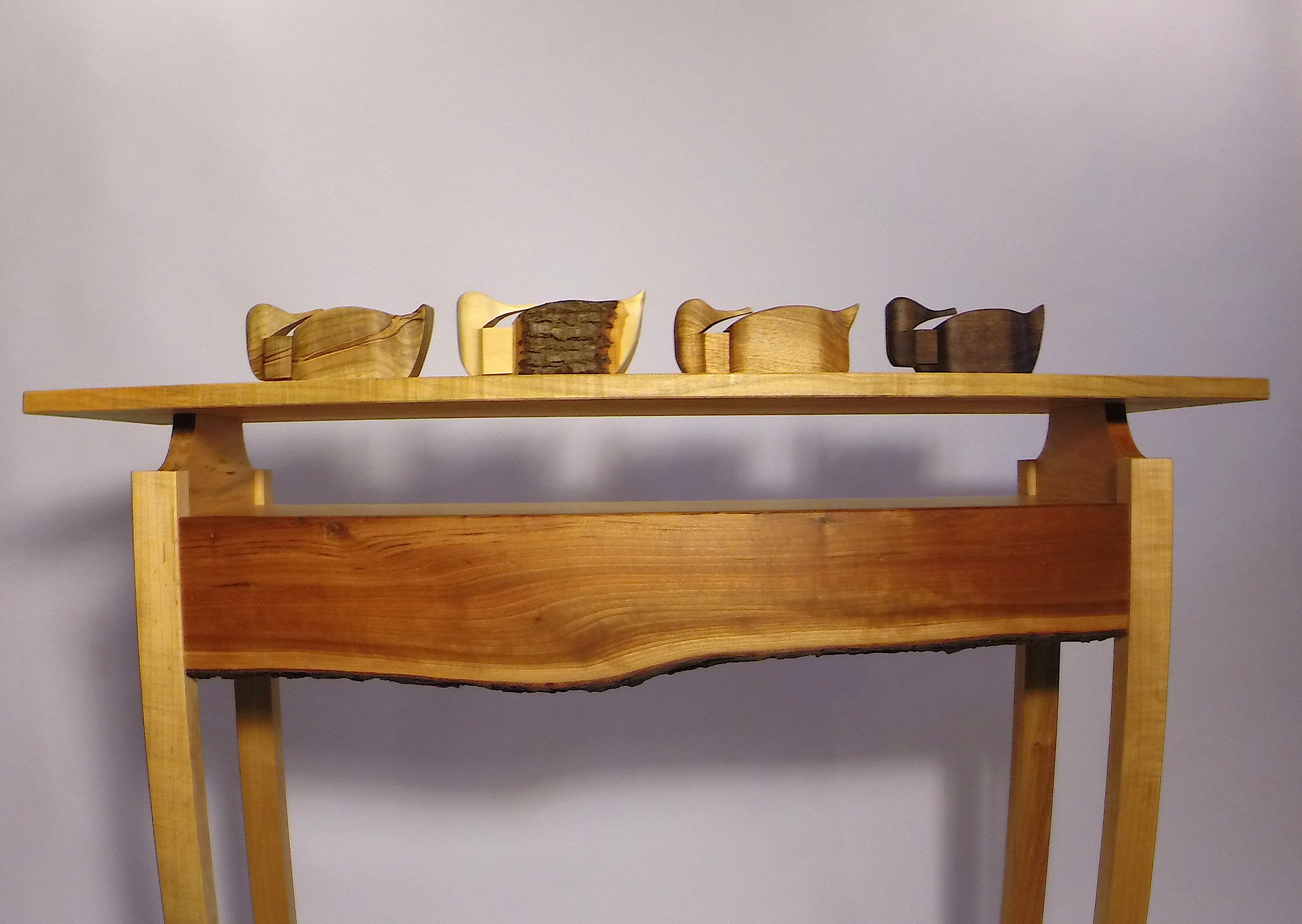 Duck Boxes Open Opened reveals secret drawer. Woods, left to right: silver maple, basswood with bark, butternut, walnut.